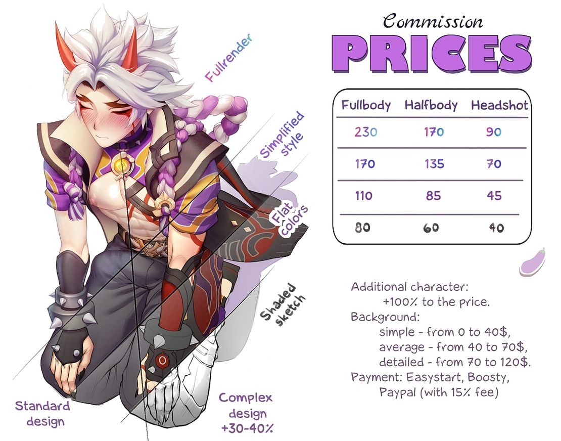 : ⁝☰ NOTE ☰⁝ :⬗ Overly detailed clothing/designs: +30-40% to the character price